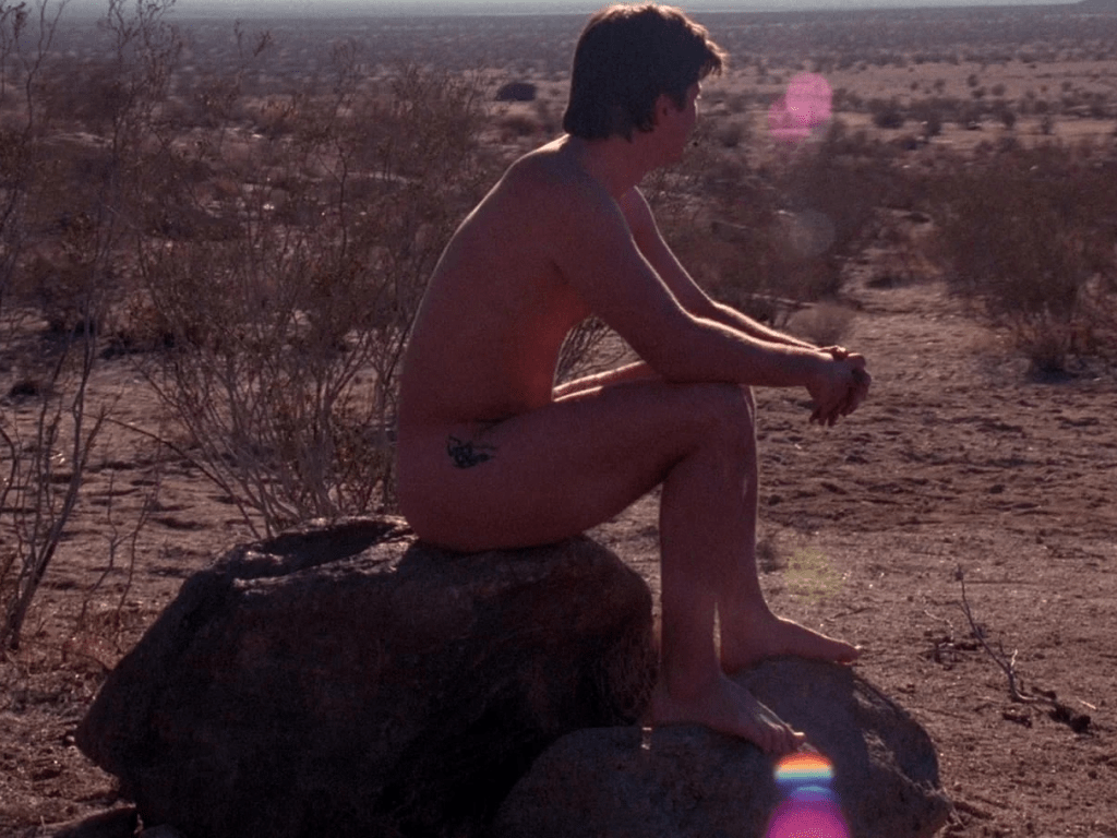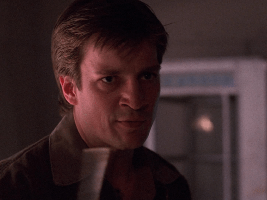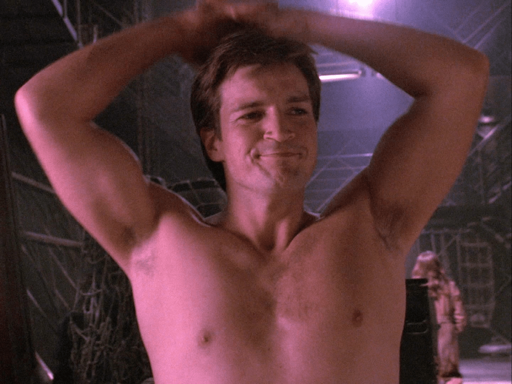 0:60 : …where Captain Malcolm Reynolds sits, naked on a rock. The tattoo is of an Egyptian glyph that translated means peace. Nathan Fillion got the body art at 19 and apparently, isn’t too fond of it.