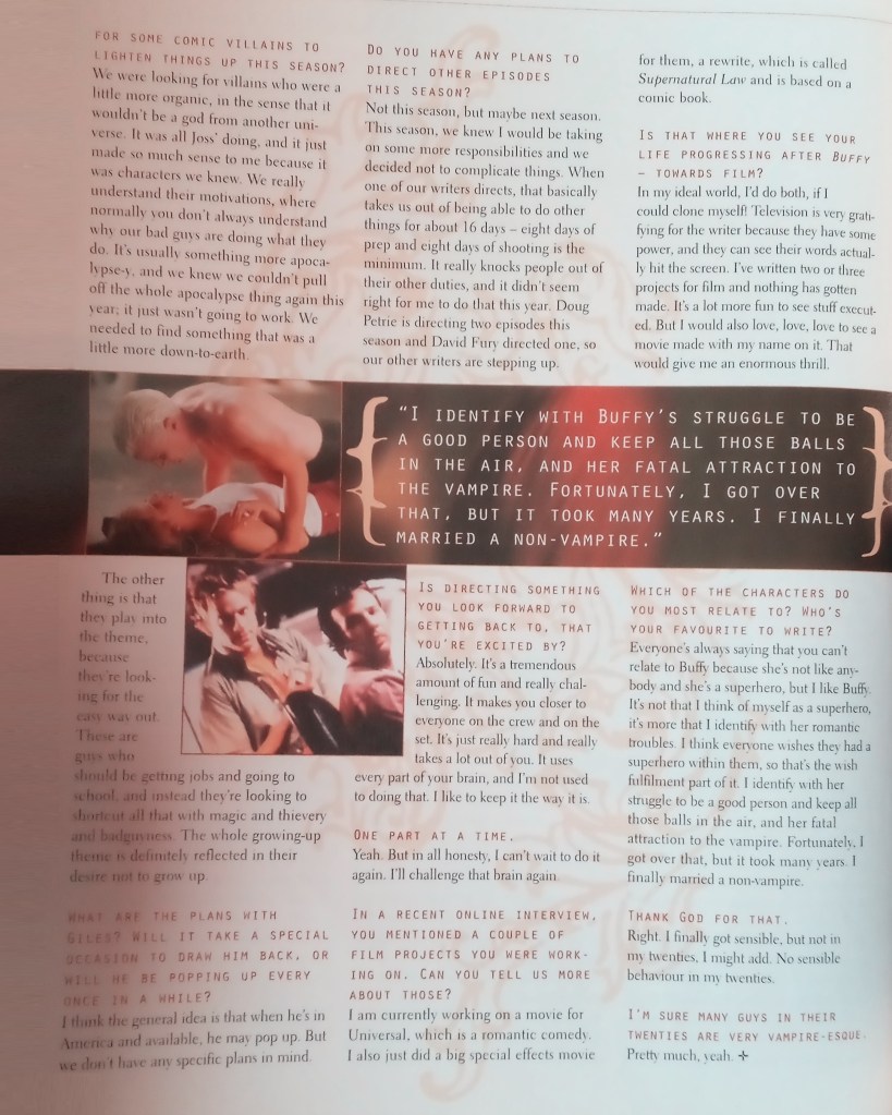Also this month, news came in of various other projects for the cast and crew. Marti Noxon had tried to secure Seth Green to return as Oz, she revealed, but Green’s commitments to Austin Powers and Greg the Bunny meant he wouldn’t have time. Amber Benson announced she would write a Willow and Tara story for the Buffy comic. And Tim Minear announced that not only was he working on the upcoming space series Firefly, but they had also found their leading man, one Nathan Fillion, who would soon be known throughout the whole gorram world.