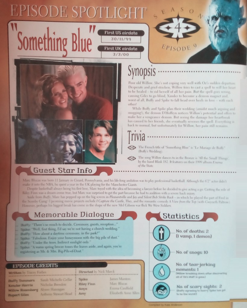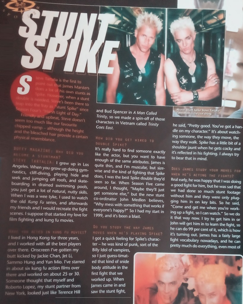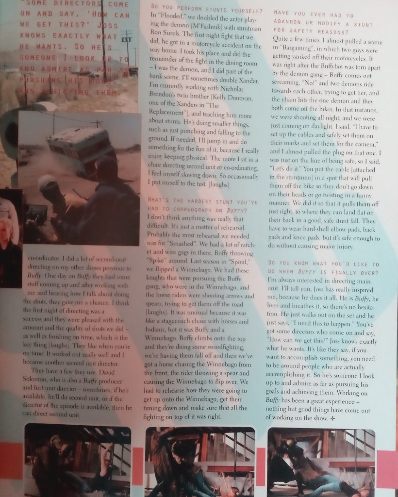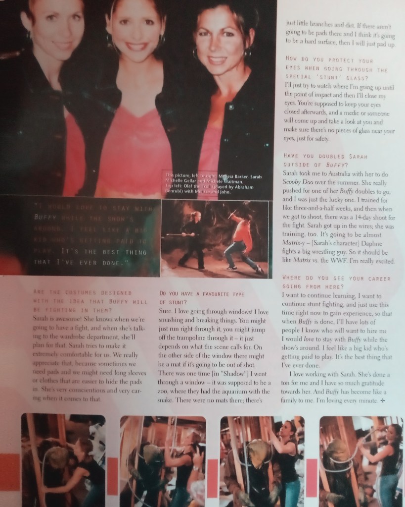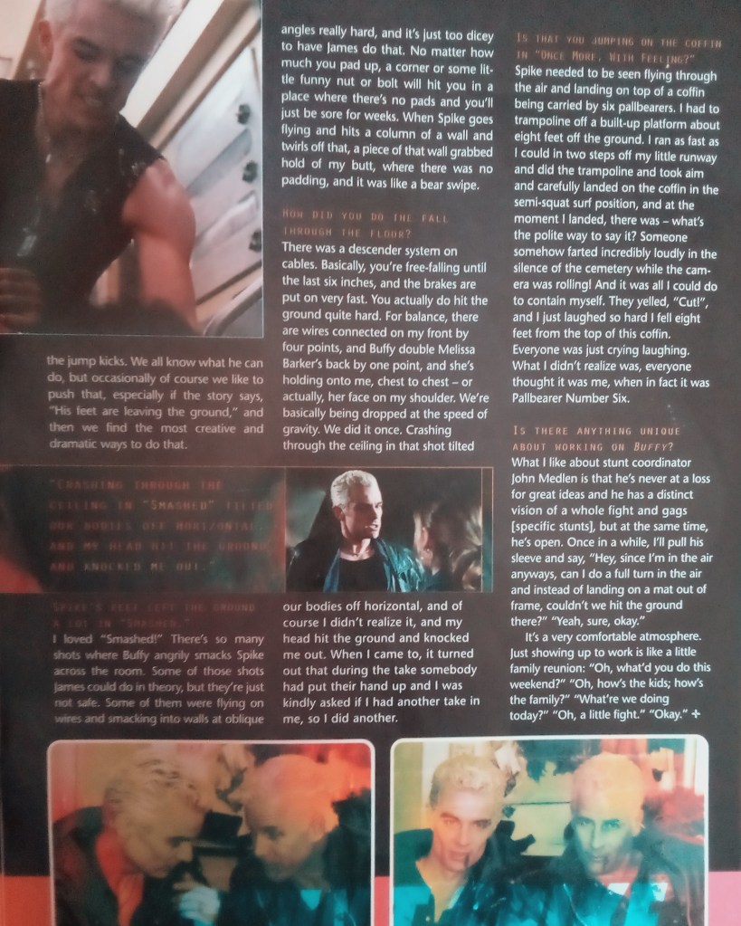 An exclusive insight into how the Buffy fight scenes are done as the magazine talks to the stunt coordinator John Medlen. and the stunt performers for Sarah Michelle Gellar and James Marsters.