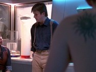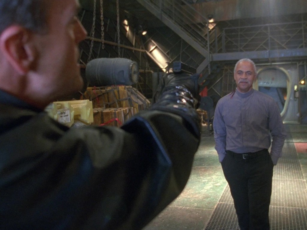 6:14 : Jonathan M. Woodward may look familiar. He’s been around the Mutant Enemy shows a few times now, turning up in Buffy‘s Conversations With Dead People as vampire Holden Webster and on Angel as the treacherous Knox. He plays Mal’s former soldier, Tracey Smith, in this episode.