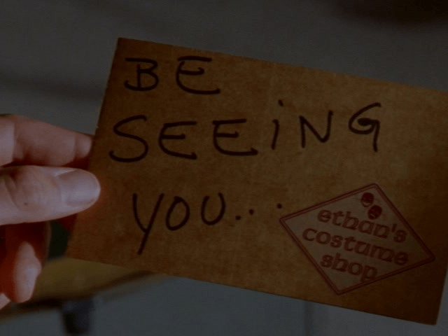 43:32 : Giles finds a card from Ethan that reads “Be seeing you…” It’s the catchphrase from cult British TV series The Prisoner, usually said in a sinister tone.