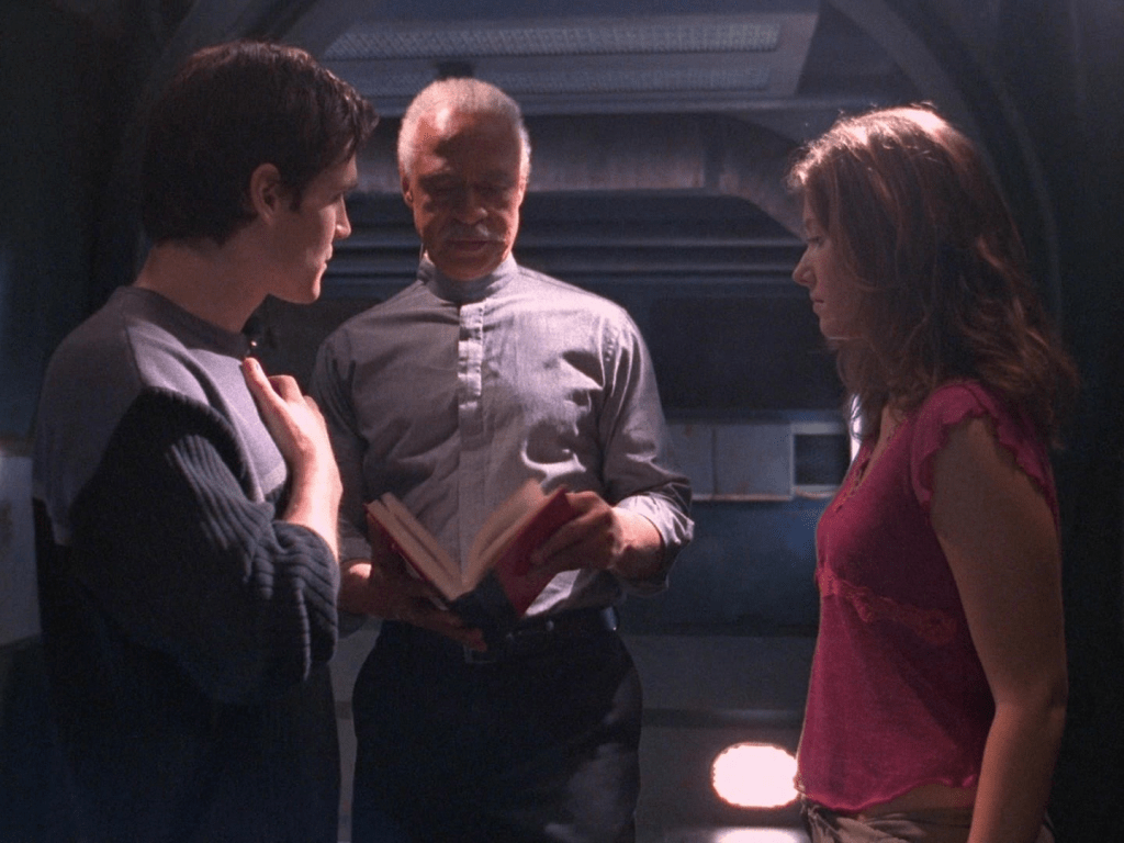 16:43 : Shepherd Book has rotten timing. For the first time since the attraction between them way back in the pilot, Kaylee and Simon’s almost first-kiss is interrupted as the Preacher retires.