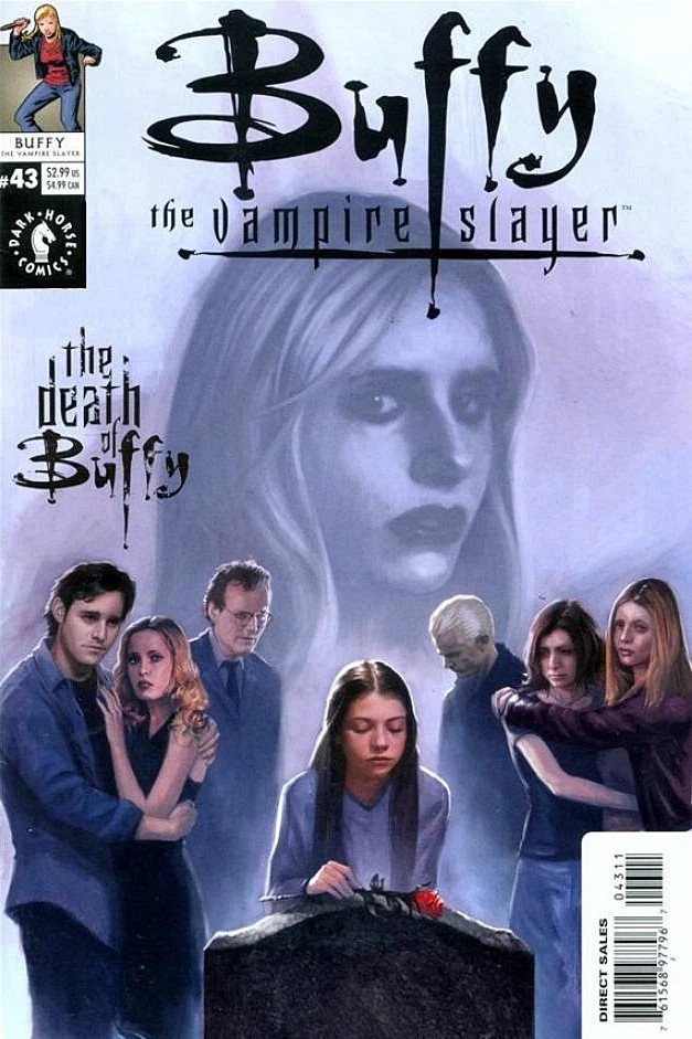 This strip is labelled as The Death of Buffy (Part 1), with material from Buffy the Vampire Slayer #43.