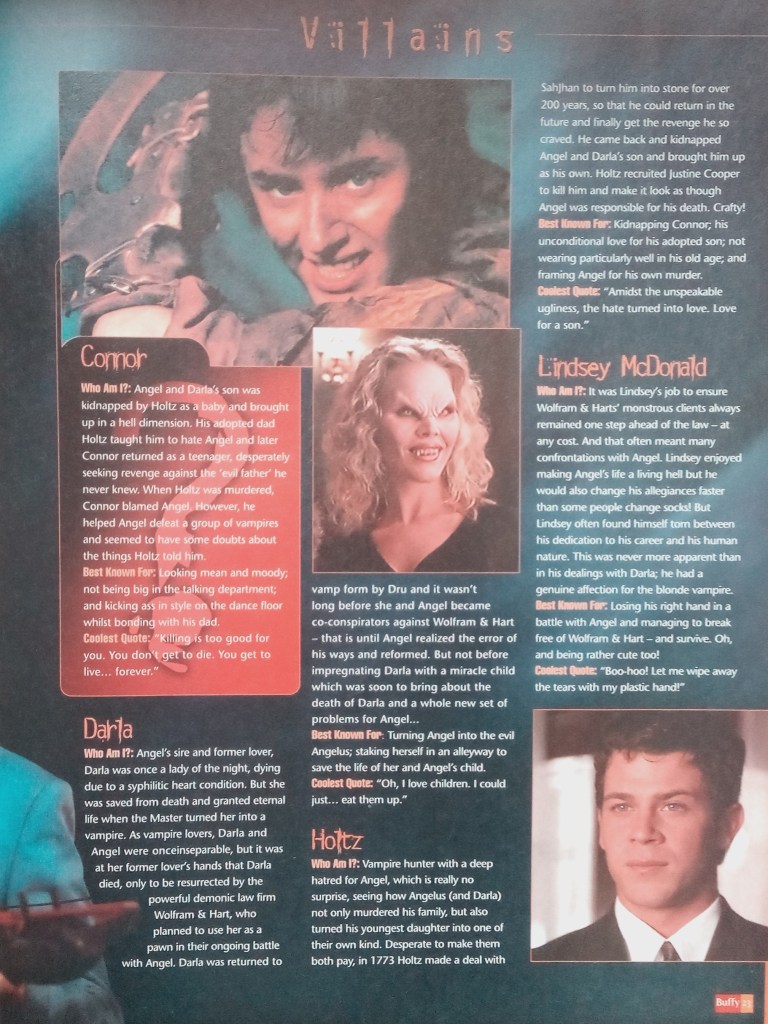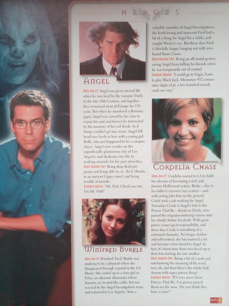 Angel writer Mere Smith begged fans not to read spoilers for the new season at the top of this issue. At the end of the last episode to air in the US, Cordelia had returned from wherever the heck she’d been since the end of that season three cliff-hanger and returned to the Hyperion – sans her memories of Team Angel and the love she and the vampire had, presumably, developed. “Were we in love?” still hadn’t answered that question.