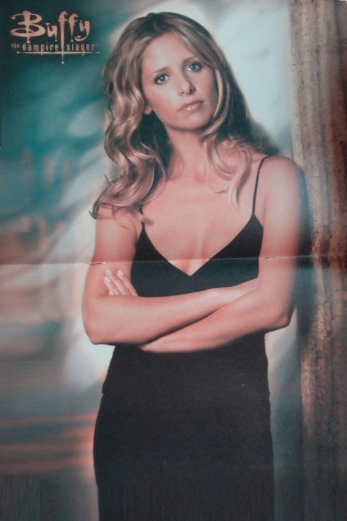 A promo shot of Sarah Michelle Gellar as Buffy, from season five. Also, a giant sized replica of the musical poster.