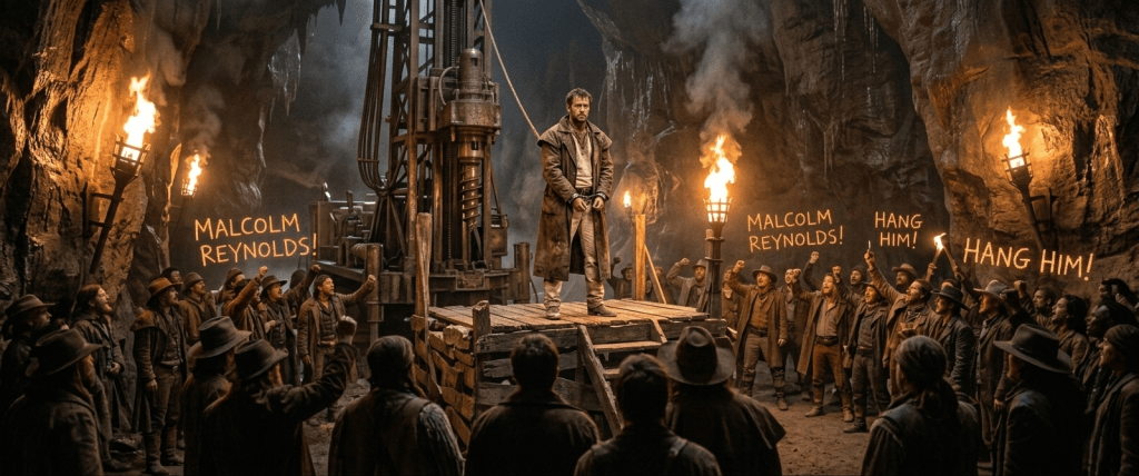 Down on that cold, barren moon, Toby finishes laying out his so‑called evidence. Mal denies every word, but Hunter Covington strolls in, smug as a cat in a creamery. He’s thrown in with the renegade Browncoats and wants to see how they handle “justice.” The crowd closes in, ignoring Mal’s protests, and they string him up. Mal’s world goes dark.
