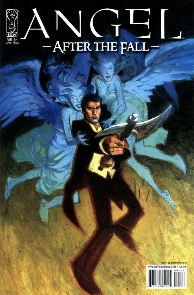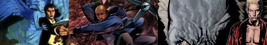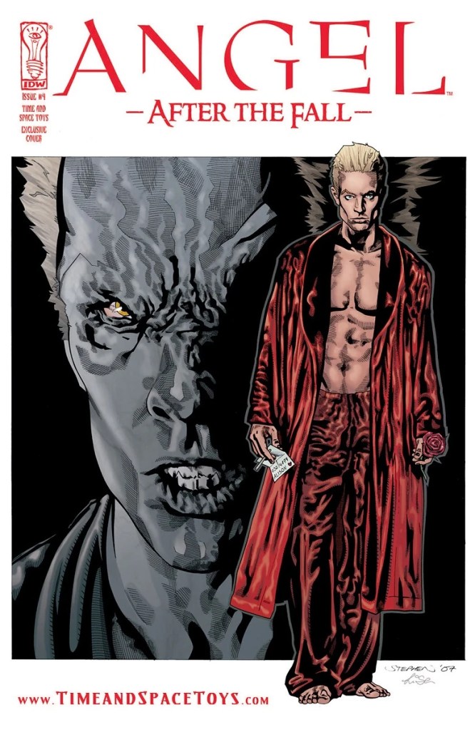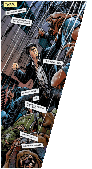 Weeks ago. The alley way behind the Hyperion Hotel. The last stand of Angel Investigations against an army of demons, sent at them by the wrath of the Senior Partners of Wolfram & Hart. Nobody has time to think. Angel‘s thoughts are scattered as he races towards the dragon: it’s switched sides. That’ll help. Then he stops. Where’s Gunn? Where’s Spike? Did Connor get far enough away?